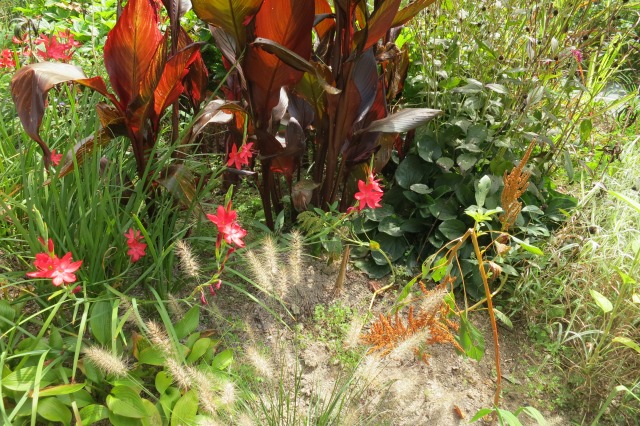 ペニセタムの穂の後ろ、銅葉カンナ(カンナオーストラリア)の前の赤い花が気になりました。